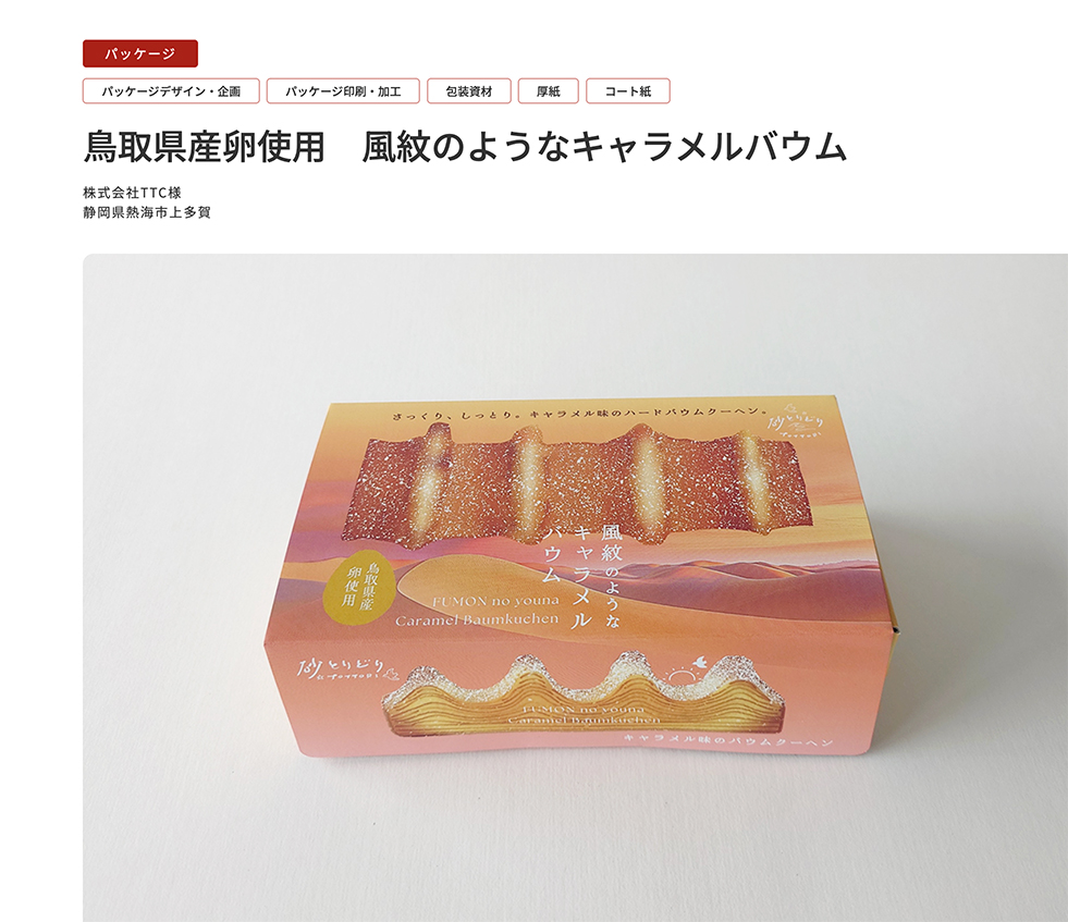 今回は、株式会社TTC様の鳥取県産卵使用 風紋のようなキャラメルバウム 化粧箱 の実績を紹介しています。