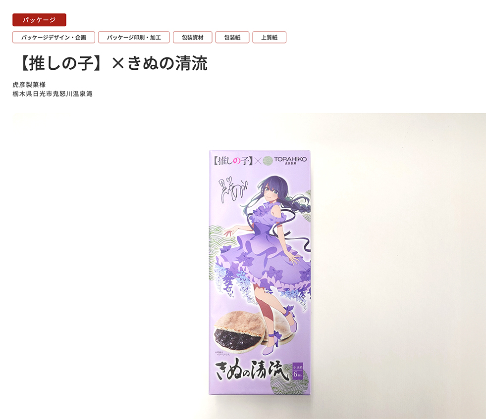 今回は、虎彦製菓様の【推しの子】×きぬの清流コラボパッケージ 包装紙 の実績を紹介しています。